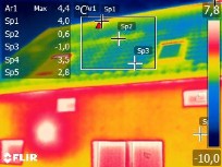 Na poniższym zdjęciu brak jest izolacji w szkielecie dachu. Ze względu na brak izolacji powietrze przedostaje się do struktury dachu, co charakterystycznie wygląda na obrazie termowizyjnym